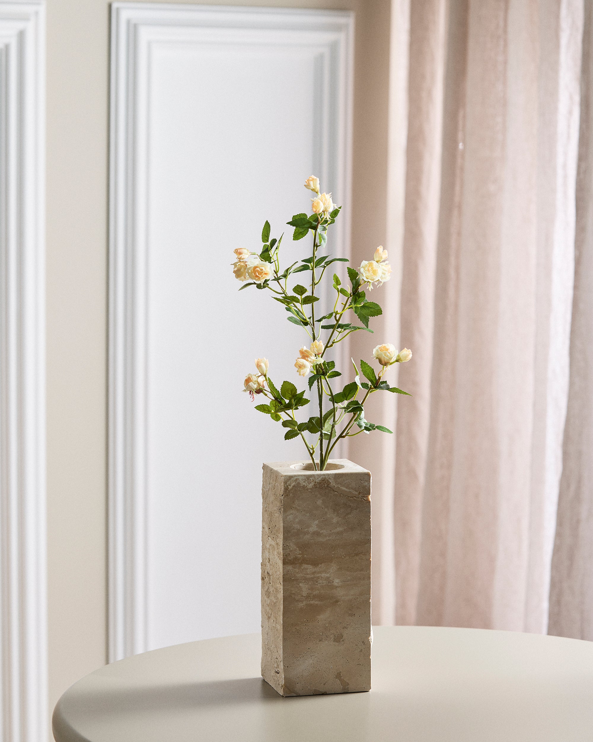 Ein Stiel, der sich anfühlt, als wäre er direkt von einem romantischen Gartenrosenbusch abgeschnitten. Mit seinen 18 zarten Blütenköpfen bringt er die Essenz des Sommers und frisch geschnittener Rosen zum Ausdruck – leicht, natürlich und voller Charme. Perfekt allein in der Vase oder als süßes Detail im Strauß.