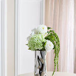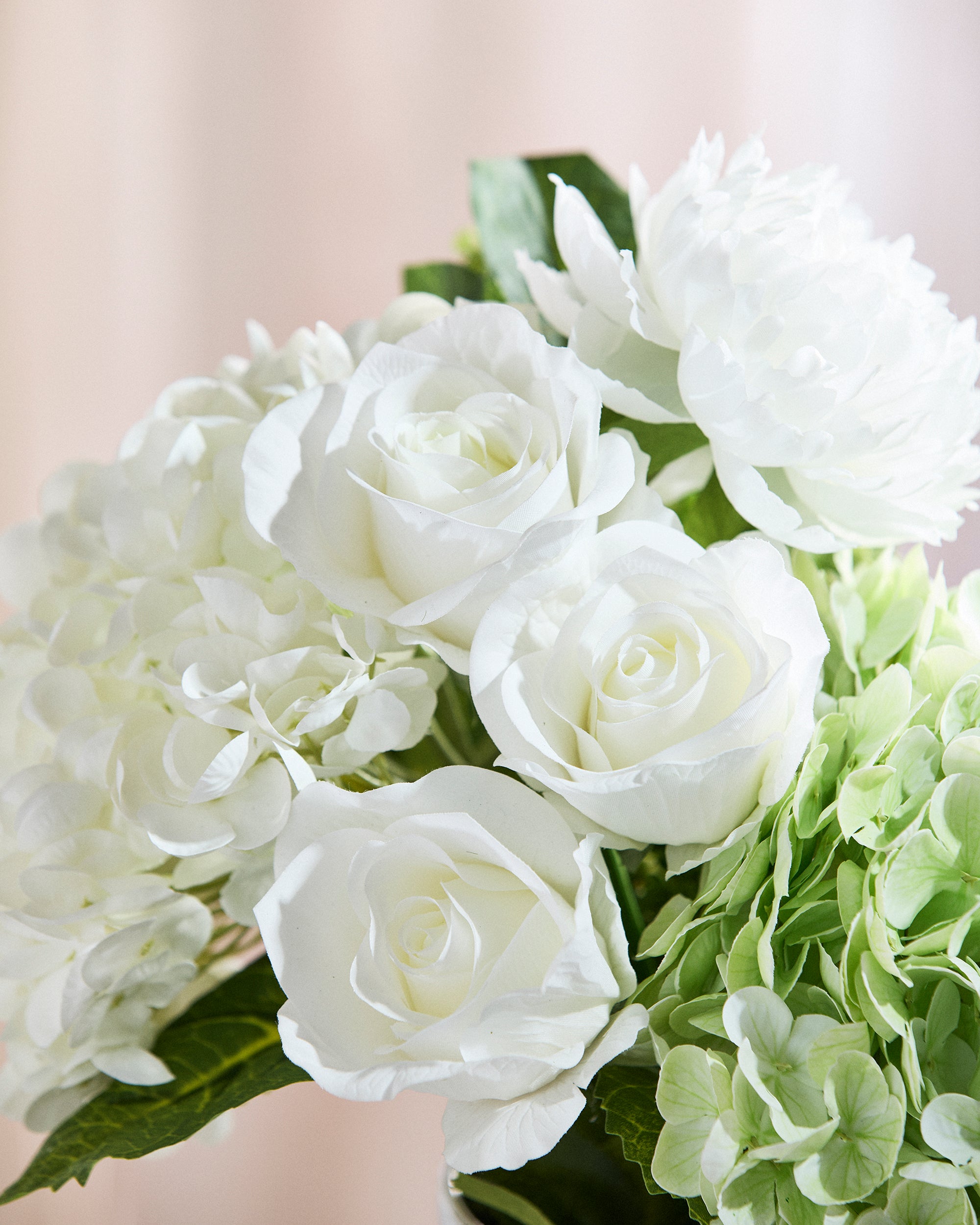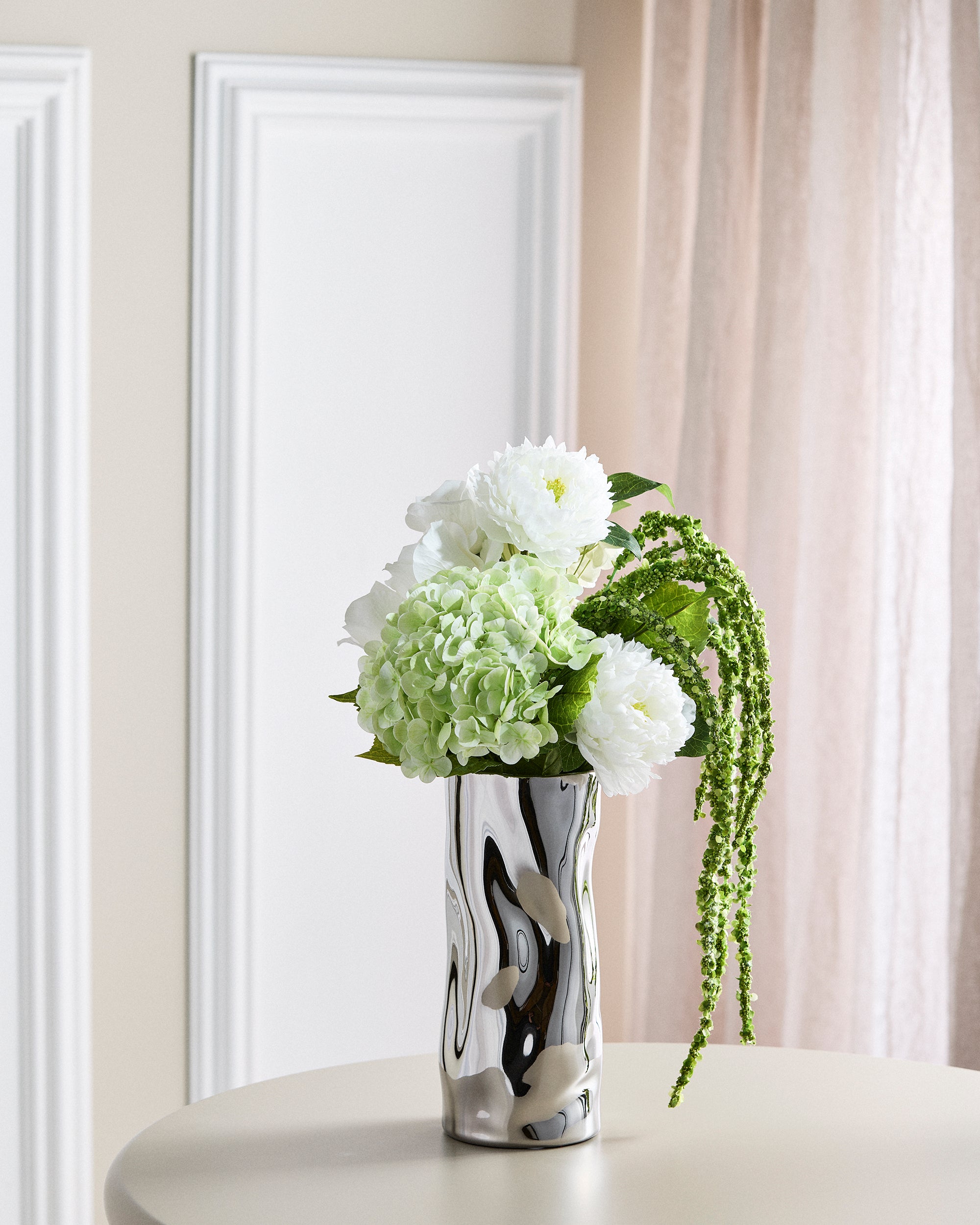Der Strauß „After Eight“ ist ein elegantes Arrangement naturgetreuer Kunstblumen, inspiriert vom frischen und kühlen Geschmack der Minze. Dieser Strauß vermittelt ein Gefühl klassischer und raffinierter Frische. Er besteht aus einer Kombination aus einer hellgrünen Hortensie, die einen Hauch dezenter Farbe verleiht, und einer weißen Hortensie, die eine weiche und einladende Basis bilden. Die zarten weißen Pfingstrosen mit ihren üppigen, geschichteten Blütenblättern sorgen für ein romantisches und luxuriöses Gefühl. Kaskadierender grüner Amarant verleiht dem Design sanfte Bewegung und natürliche Textur. Weiße Rosen mit ihrer zeitlosen Schönheit runden den Strauß ab und vermitteln ein Gefühl von Reinheit und Ruhe. Der Strauß „After Eight“ ist perfekt ausbalanciert und verkörpert eine kühle, frische Eleganz, die an den erfrischenden Geschmack von Minze erinnert.