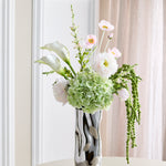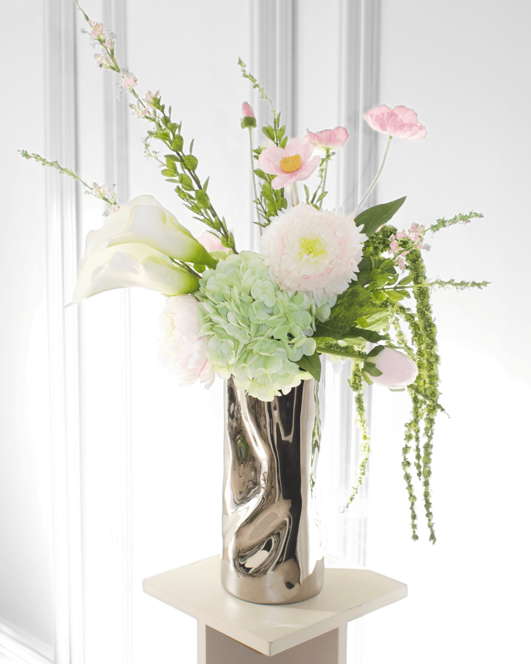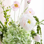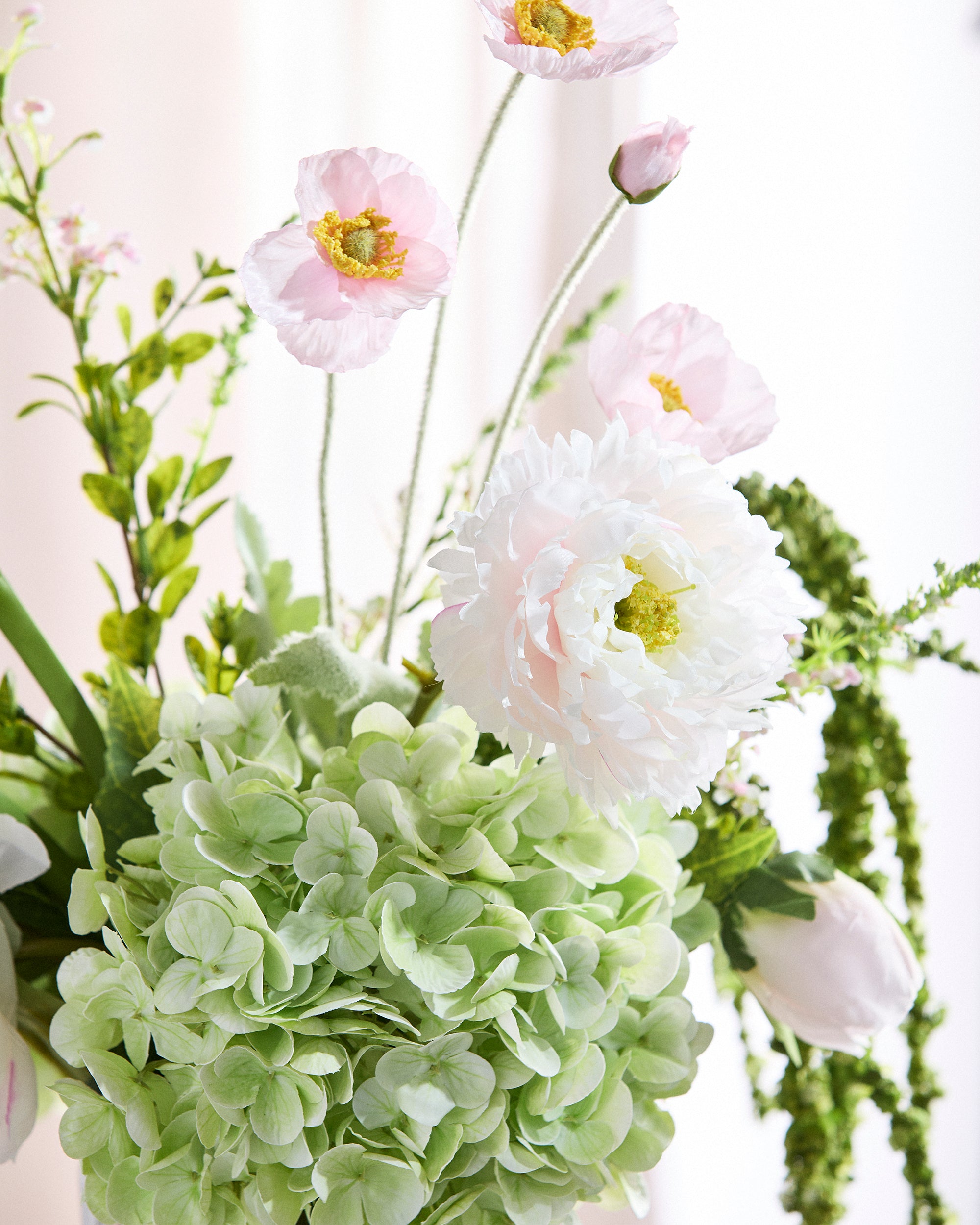 Der Strauß „Bubblegum Bliss“ ist ein bezauberndes Arrangement naturgetreuer Kunstblumen, inspiriert vom verspielten und süßen Wesen des Kaugummis mit seinen zarten Rosa- und Minzgrüntönen. Hellrosa Pfingstrosen verleihen diesem entzückenden Strauß mit ihren geschichteten Blütenblättern einen Hauch von Romantik und Üppigkeit. Hellgrüne Hortensien bilden eine frische und luftige Basis und ergänzen die Farbpalette des Straußes perfekt. Elegante Callas verleihen dem Design ein raffiniertes Element, während hellrosa Salbei Struktur und eine verspielte Note verleiht. Kaskadierende Amaranthblüten sorgen für ein Gefühl von Bewegung, und eine Mischung aus rosa und hellrosa Mohnblüten setzt einen fröhlichen, lebendigen Akzent. Der Strauß „Bubblegum Bliss“ fängt den fröhlichen und unbeschwerten Geist seines Namensgebers wunderschön ein und ist damit eine reizvolle Ergänzung für jede Umgebung.