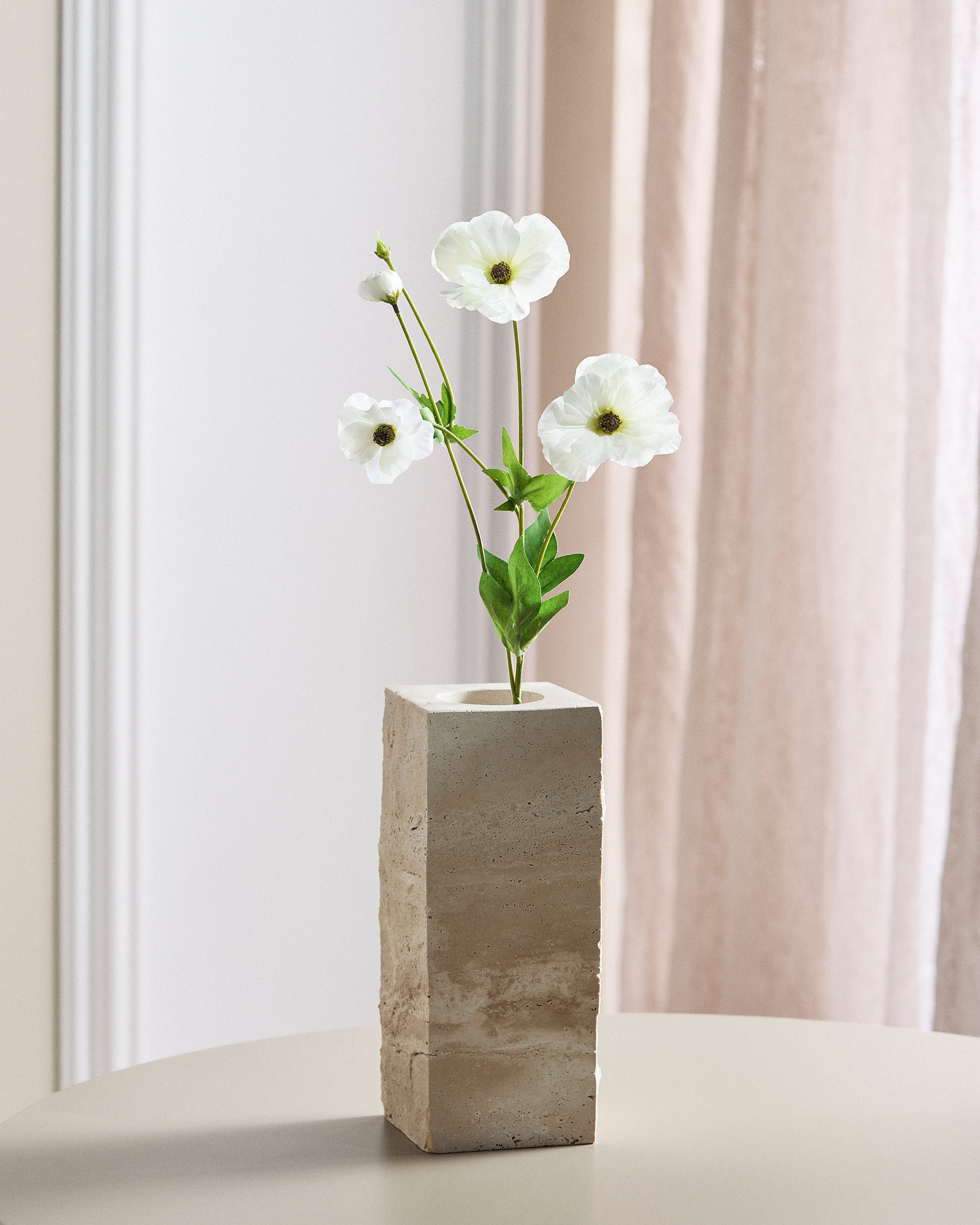 Diese zarte Schmetterlings-Ranunkel wirkt schlank und anmutig. Der Stiel besteht aus fünf Blüten: zwei voll erblühten Blüten, einer teilweise erblühten Blüte, einer fast erblühten Blüte und einer Knospe. Die Blüten sind aus Seide gefertigt, was ihnen ihr anmutiges Aussehen verleiht.
