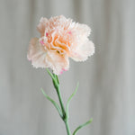Jede Nelke ist handgefertigt aus Seide mit einer weichen Latexbeschichtung, die den Blütenblättern eine lebensechte Struktur und Haptik verleiht. Die gewellten, geschichteten Blütenblätter in einem dezenten Champagnerton schaffen einen üppigen und realistischen Eindruck, der sowohl in klassische als auch moderne Dekorationen wunderbar passt.