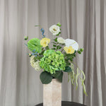 Eine frische, botanische Komposition in Grüntönen mit zartem Gelb und einem Hauch Blau. Die Farben balancieren sich mit Leichtigkeit und Präzision.
