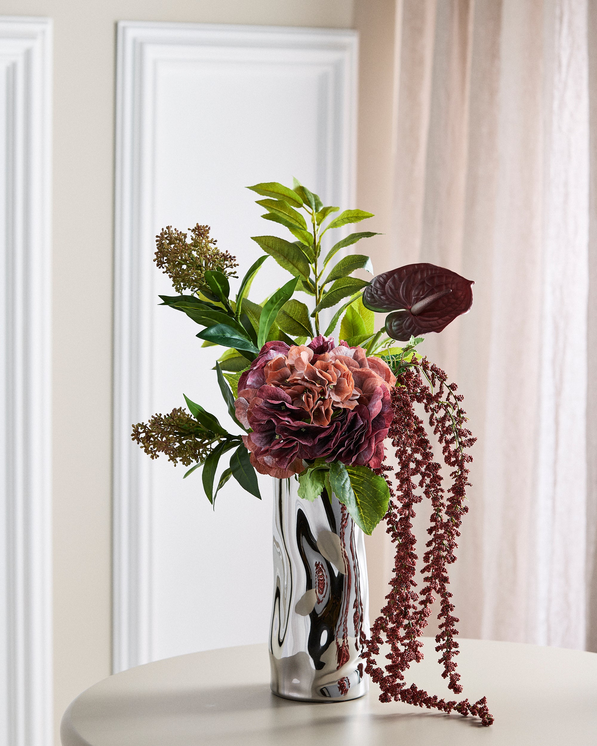 „Falling for Fall“ ist ein ausdrucksstarker und dramatischer Blumenstrauß mit dunkelroten Hortensien und Anthurien, die durch harmonisch abgestimmte grüne Elemente ergänzt werden. Perfekt für alle, die sich einen modernen, extravaganten Strauß wünschen, der in ihrem Zuhause ein klares und selbstbewusstes Statement setzt.