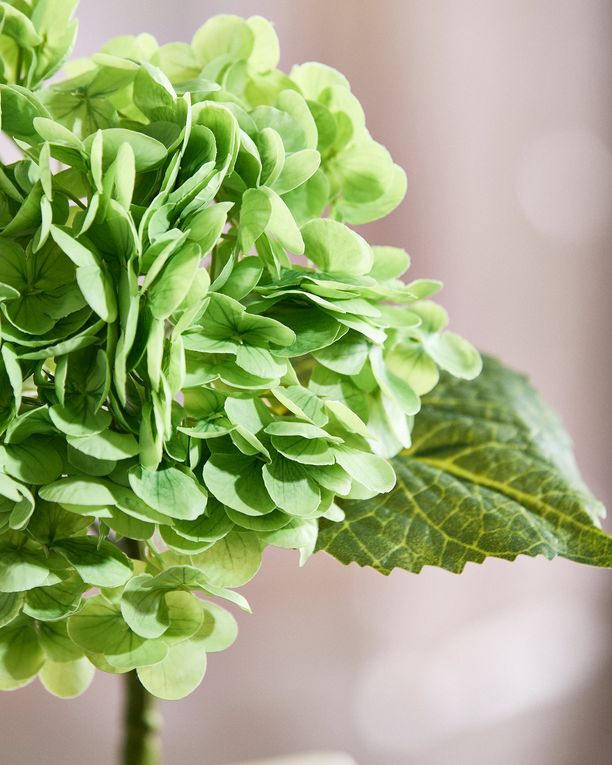 Unsere neuen, größeren, üppigen Hortensienblüten wirken beeindruckend naturgetreu und bestechen durch ihre naturalistische Textur und authentische Blattadern auf den leuchtend grünen Blättern, die zu einem insgesamt realistischen Erscheinungsbild beitragen. Diese Blüten sind nicht nur optisch bezaubernd, sondern verleihen durch ihre naturgetreue Struktur auch eine haptische Dimension.
