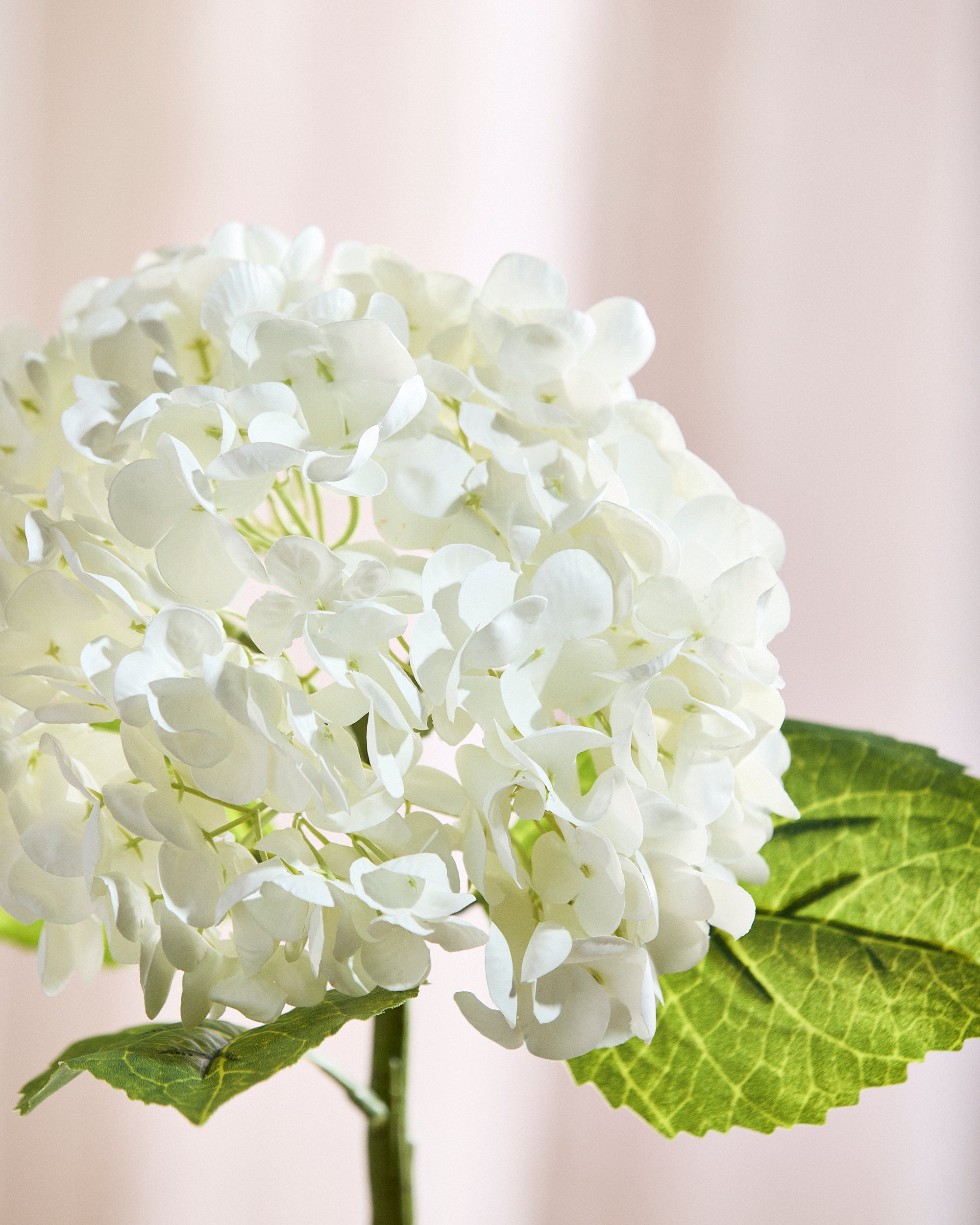 Unsere neuen, größeren, üppigen Hortensienblüten wirken beeindruckend naturgetreu und bestechen durch ihre naturalistische Textur und authentische Blattadern auf den leuchtend grünen Blättern, die zu einem insgesamt realistischen Erscheinungsbild beitragen. Diese Blüten sind nicht nur optisch bezaubernd, sondern verleihen durch ihre naturgetreue Struktur auch eine haptische Dimension.