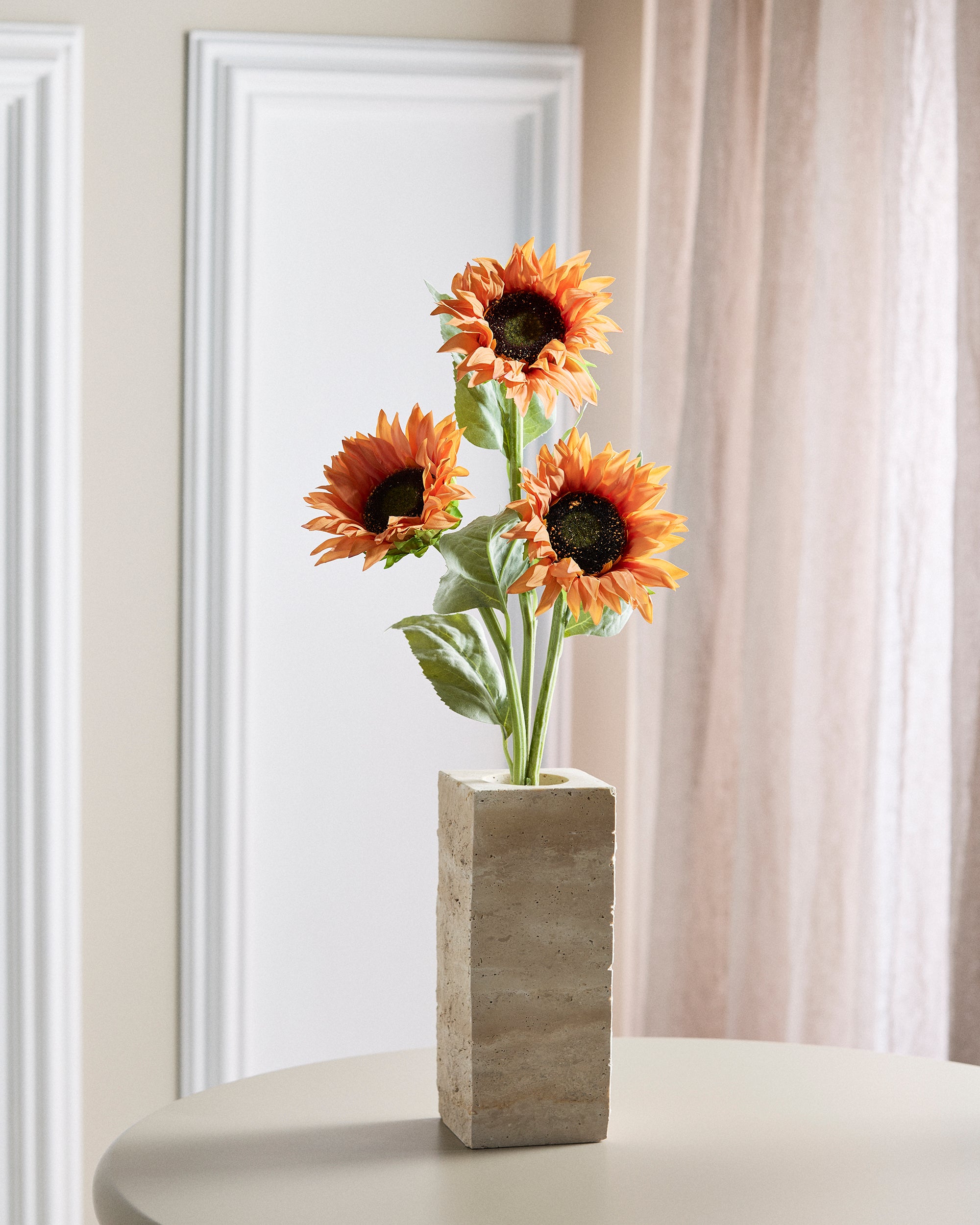 Eine bunte Mischung naturgetreuer Sonnenblumen in gebrannten Orangetönen. Seidig-weiche Blütenblätter und feine Latexdetails – fast wie frisch gepflückt.