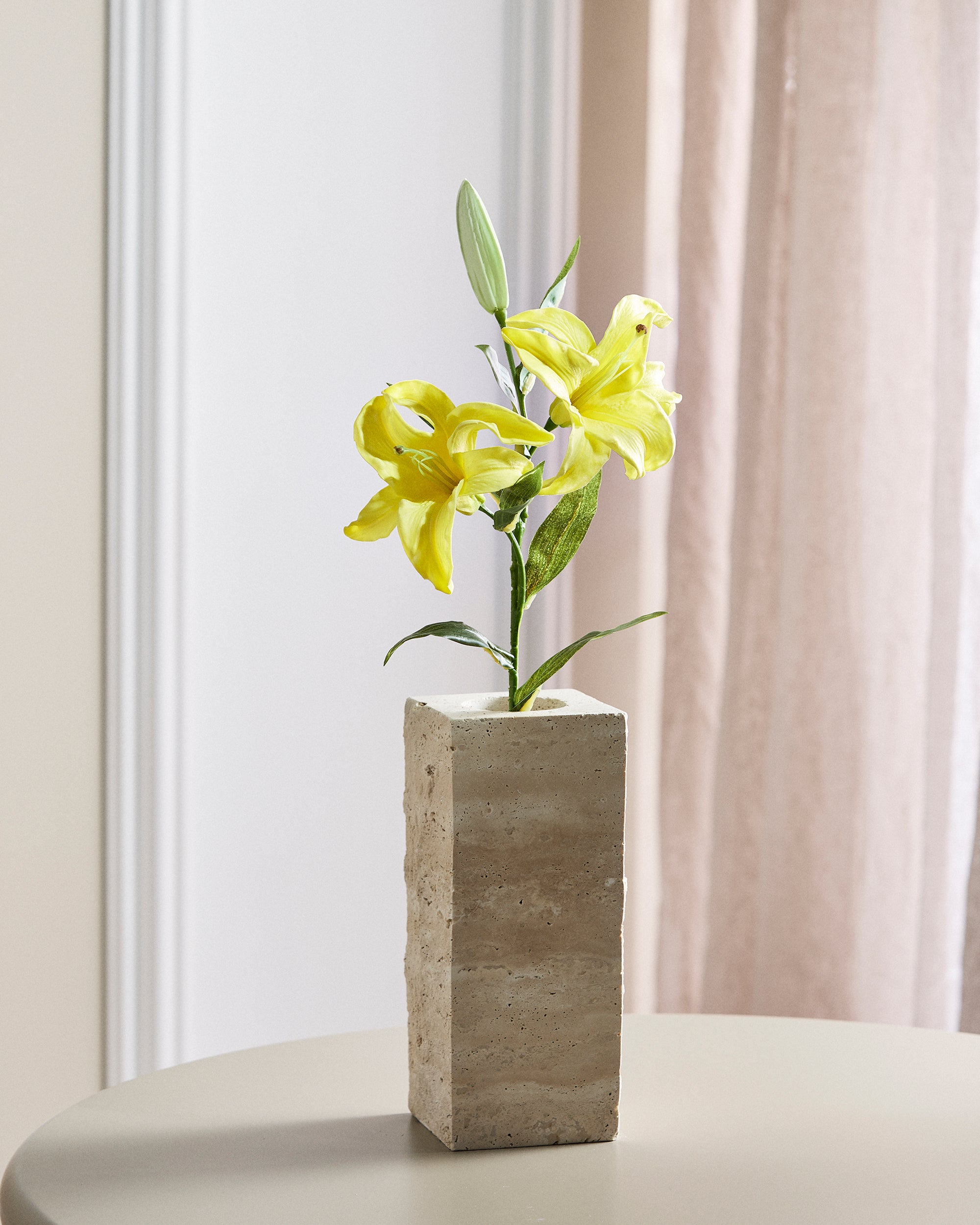 Unsere dreiköpfige Lilienblüte besteht aus zwei vollständig erblühten Blüten und einer, die noch darauf wartet, sich zu entfalten, wodurch ein unglaublich lebensechtes und dynamisches Bild entsteht.
