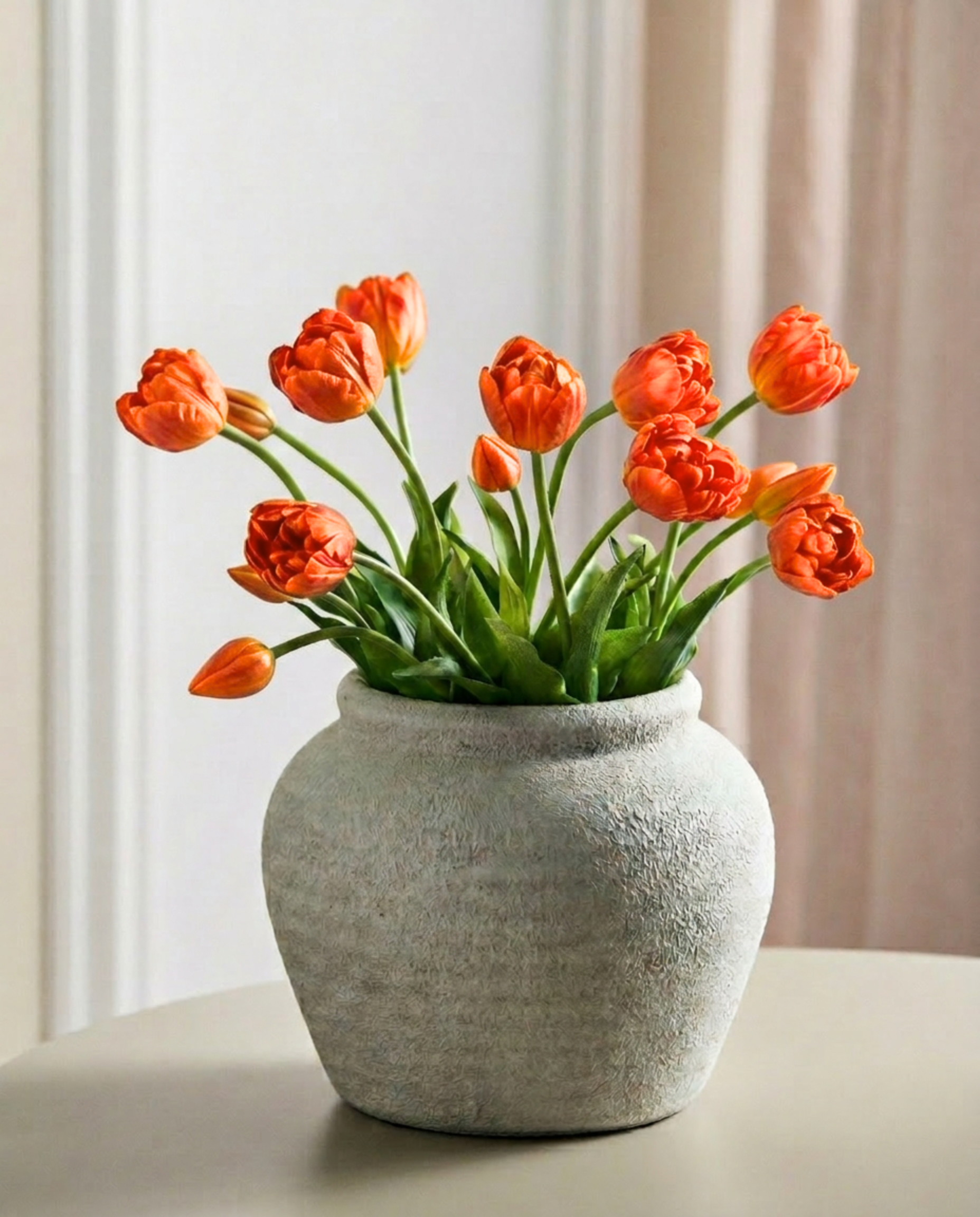 Jede Tulpe wird von Hand aus weichem Latex gefertigt und verfügt über mehrschichtige Blütenblätter in zarten Farbtönen und subtilen Variationen in Form und Textur. Das Ergebnis ist eine natürliche Fülle und Detailtreue, die die Essenz echter Tulpen einfängt – so realistisch, dass man den Unterschied kaum erkennen kann.