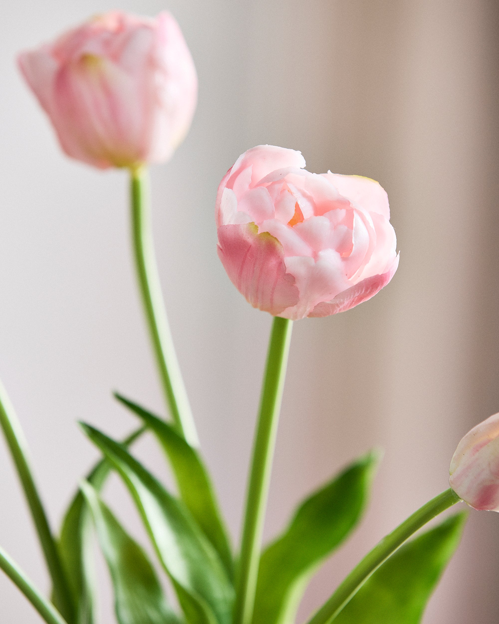 Jede Tulpe wird von Hand aus weichem Latex gefertigt und verfügt über mehrschichtige Blütenblätter in zarten Farbtönen und subtilen Variationen in Form und Textur. Das Ergebnis ist eine natürliche Fülle und Detailtreue, die die Essenz echter Tulpen einfängt – so realistisch, dass man den Unterschied kaum erkennen kann.