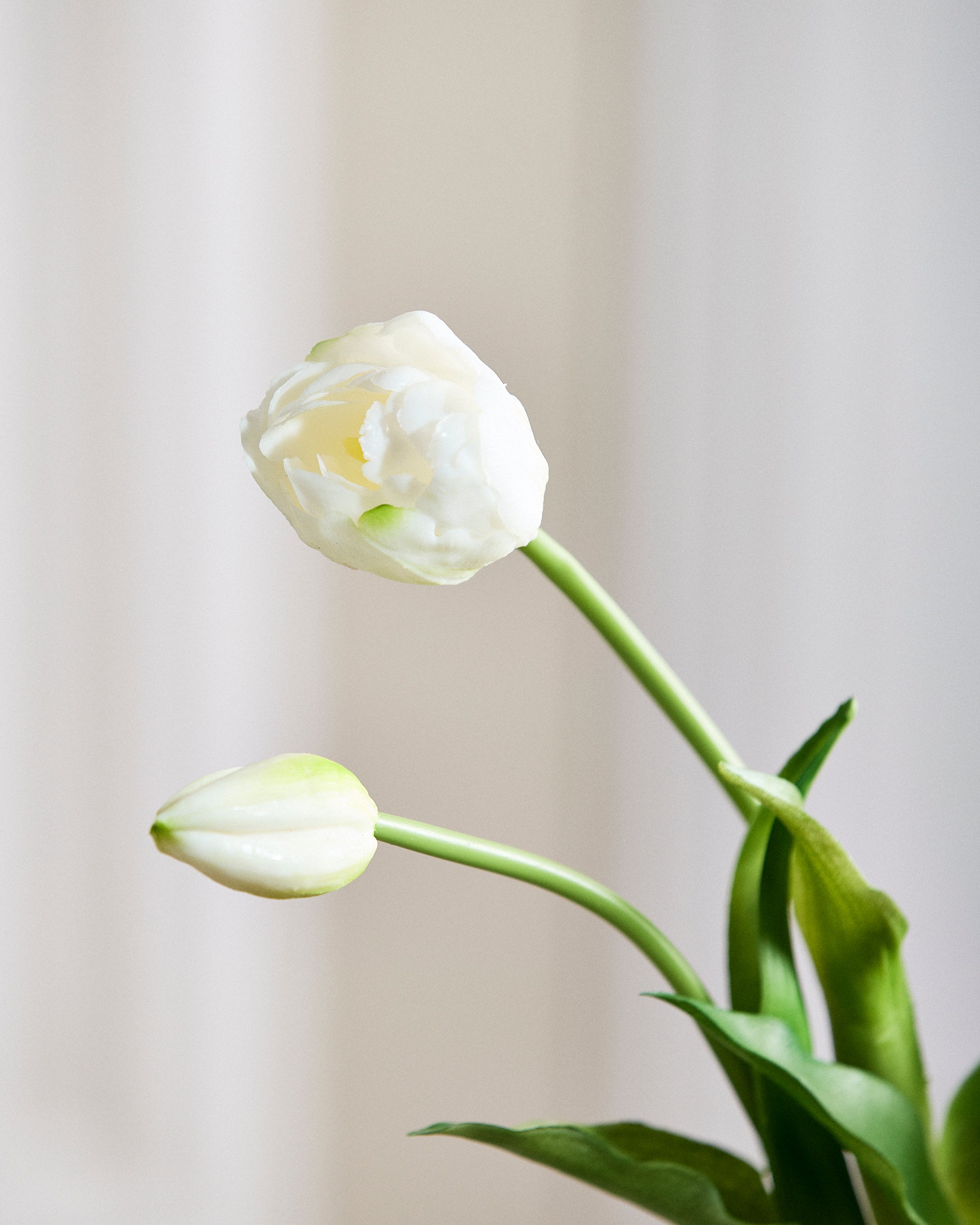 Jede Tulpe wird von Hand aus weichem Latex gefertigt und verfügt über mehrschichtige Blütenblätter in zarten Farbtönen und subtilen Variationen in Form und Textur. Das Ergebnis ist eine natürliche Fülle und Detailtreue, die die Essenz echter Tulpen einfängt – so realistisch, dass man den Unterschied kaum erkennen kann.
