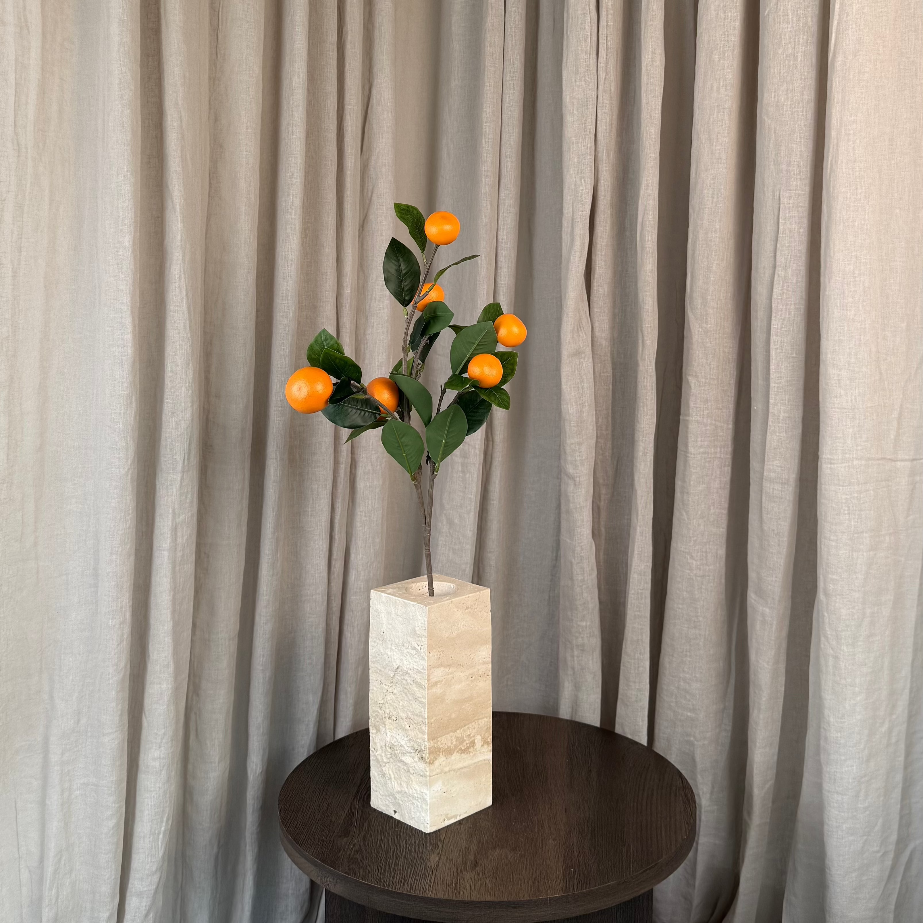 Jeder Zweig ist handgefertigt und besteht aus naturgetreuen Mandarinen aus weichem Schaumstoff, der die feine Struktur und das Farbspiel der Früchte perfekt wiedergibt. Die prallen Früchte und grünen Blätter weisen subtile Variationen in Schattierungen und Formen auf und sorgen so für beeindruckenden Realismus.