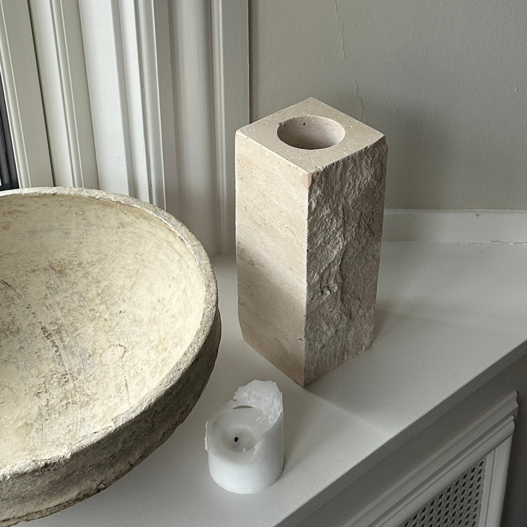 Unsere exklusive Onyx Vase besteht aus natürlichem, rohem Travertin. Sie ist mit einem spannenden Kontrast zwischen zwei rohen und zwei glatten Seiten gestaltet, wodurch ein faszinierendes Spiel von Texturen und Oberflächen entsteht.