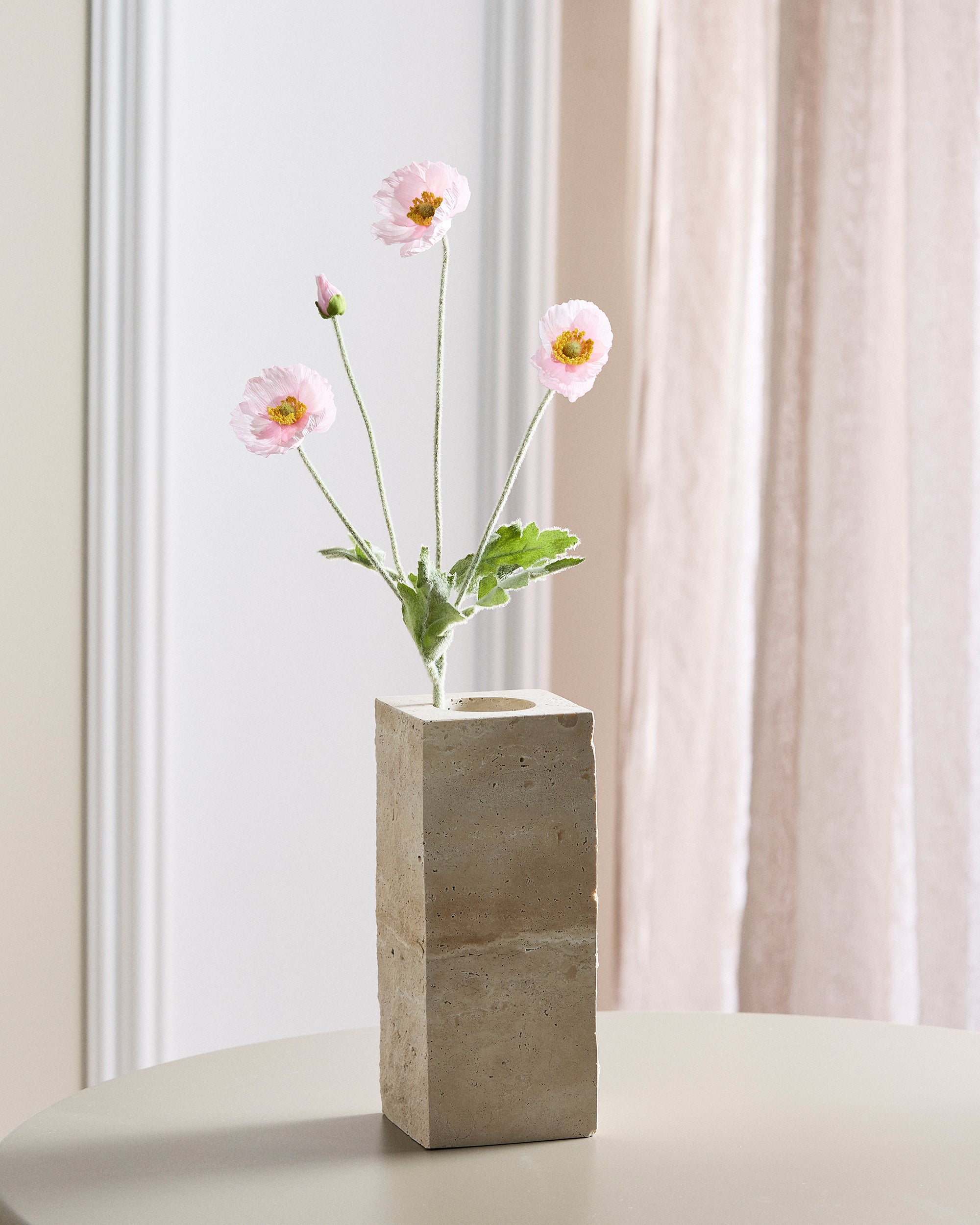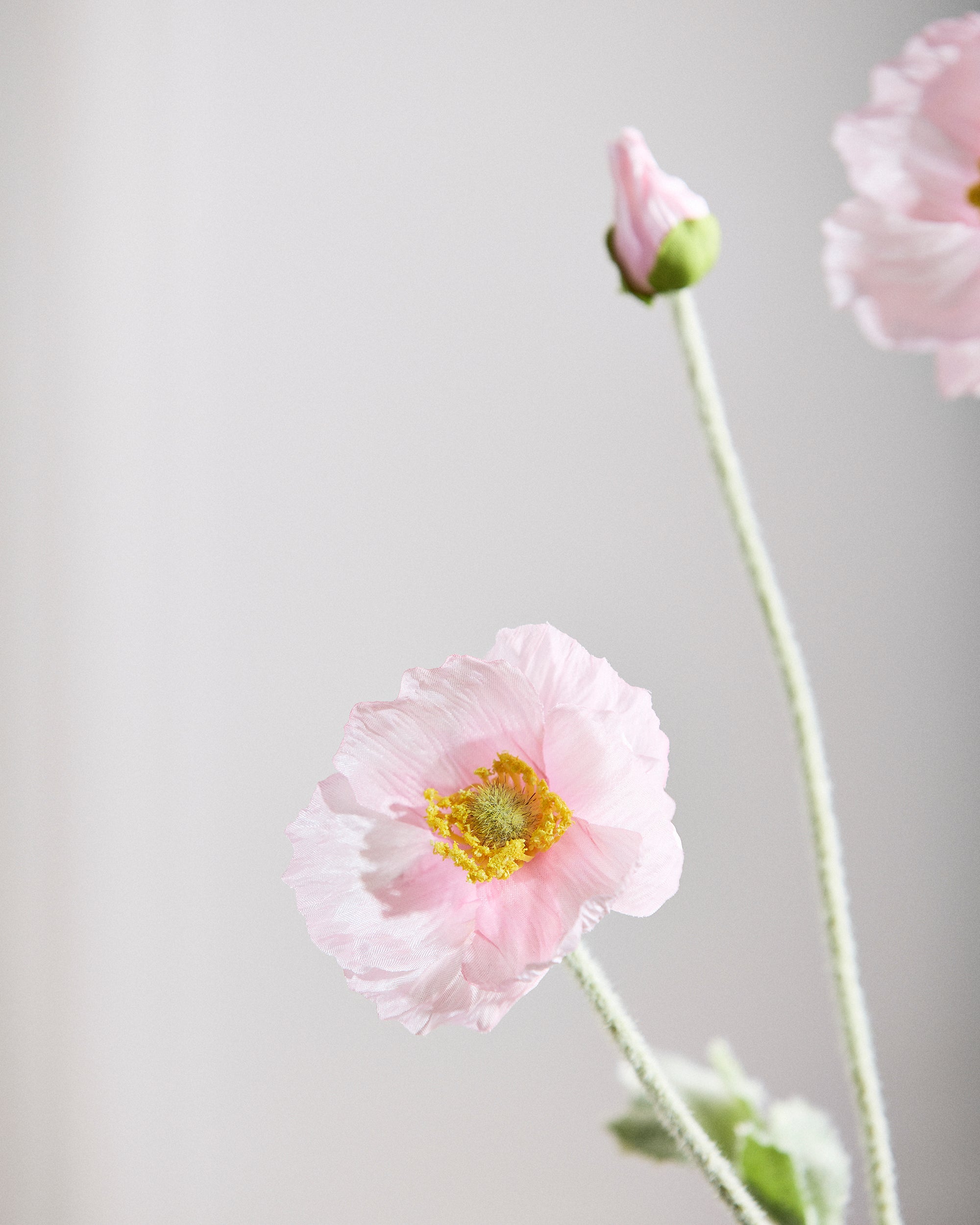 Die Stiele und Blätter sind sorgfältig mit kleinen Härchen bedeckt, wodurch das natürliche Aussehen einer Mohnblume nachgebildet wird und ihrer Schönheit eine authentische Dimension verliehen wird.