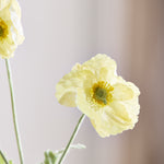 Eine buttergelbe Mohnblüte mit weichen, gedeckten Seidenblütenblättern – latexbeschichtet für ein naturgetreues, haptisches Erlebnis. Die Blütenblätter haben eine matte Oberfläche und eine kühle, natürliche Textur, genau wie eine frisch gepflückte Blume. Wunderschön allein oder in Kombination mit Komplementärfarben.