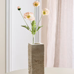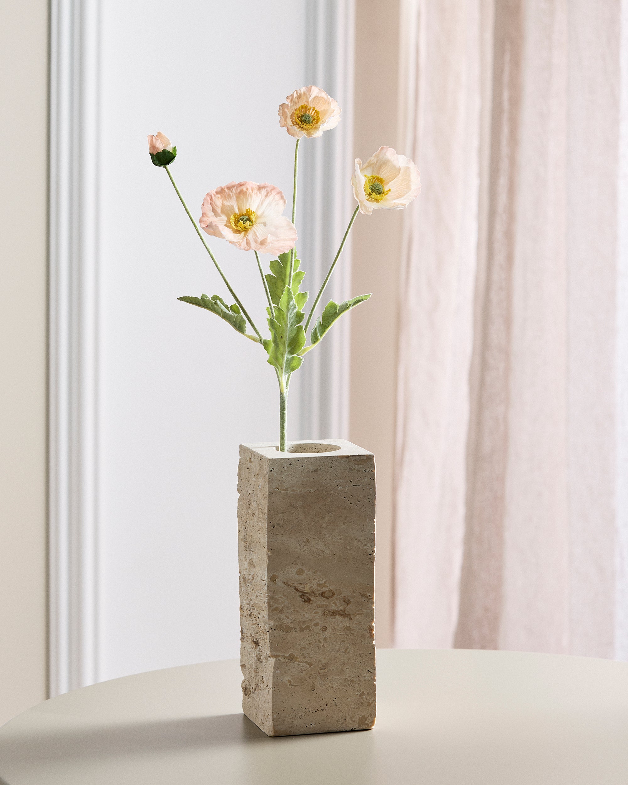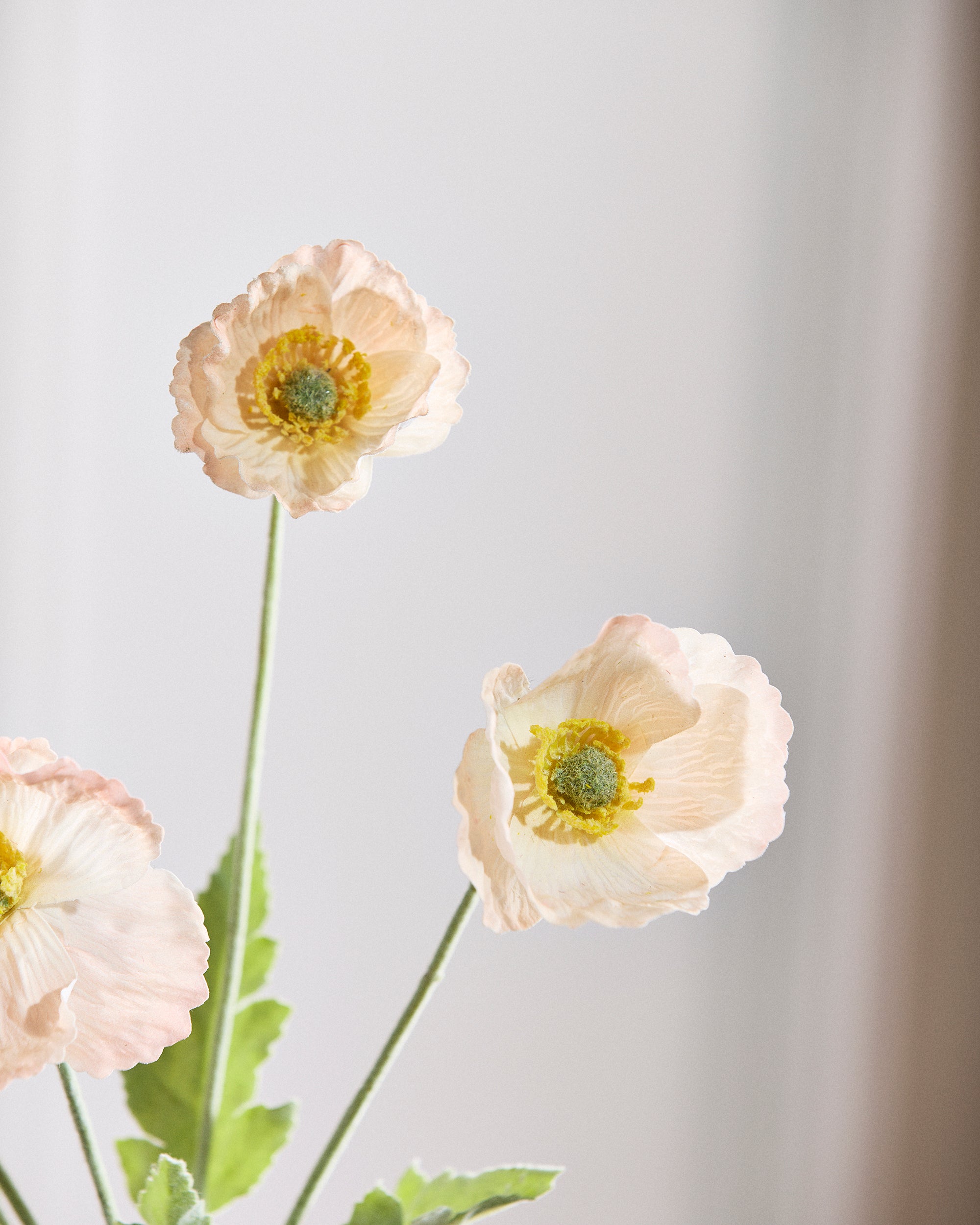 Eine Champagne Mohnblüte mit weichen, gedeckten Seidenblütenblättern – latexbeschichtet für ein naturgetreues, haptisches Erlebnis. Die Blütenblätter haben eine matte Oberfläche und eine kühle, natürliche Textur, genau wie eine frisch gepflückte Blume. Wunderschön allein oder in Kombination mit Komplementärfarben.