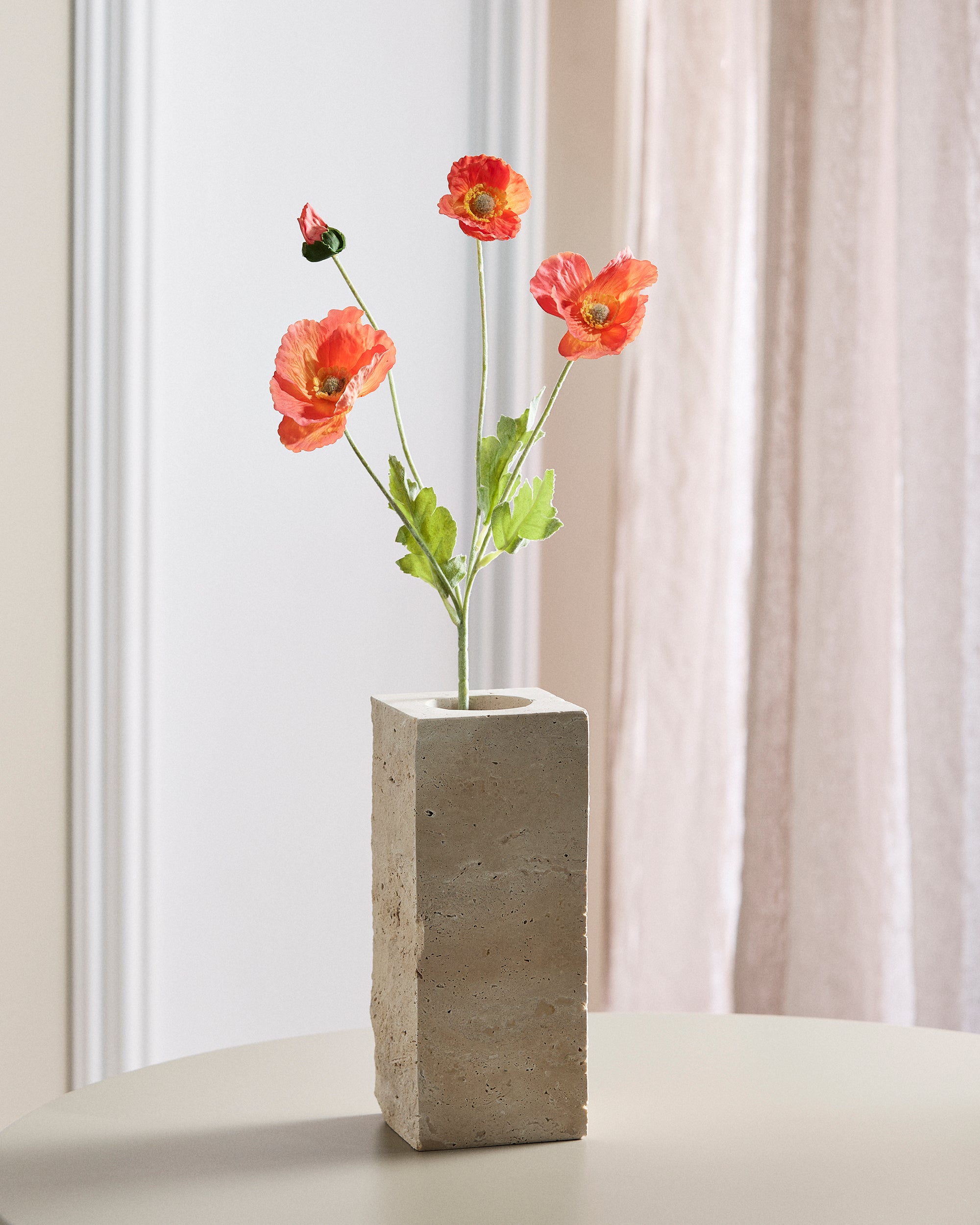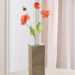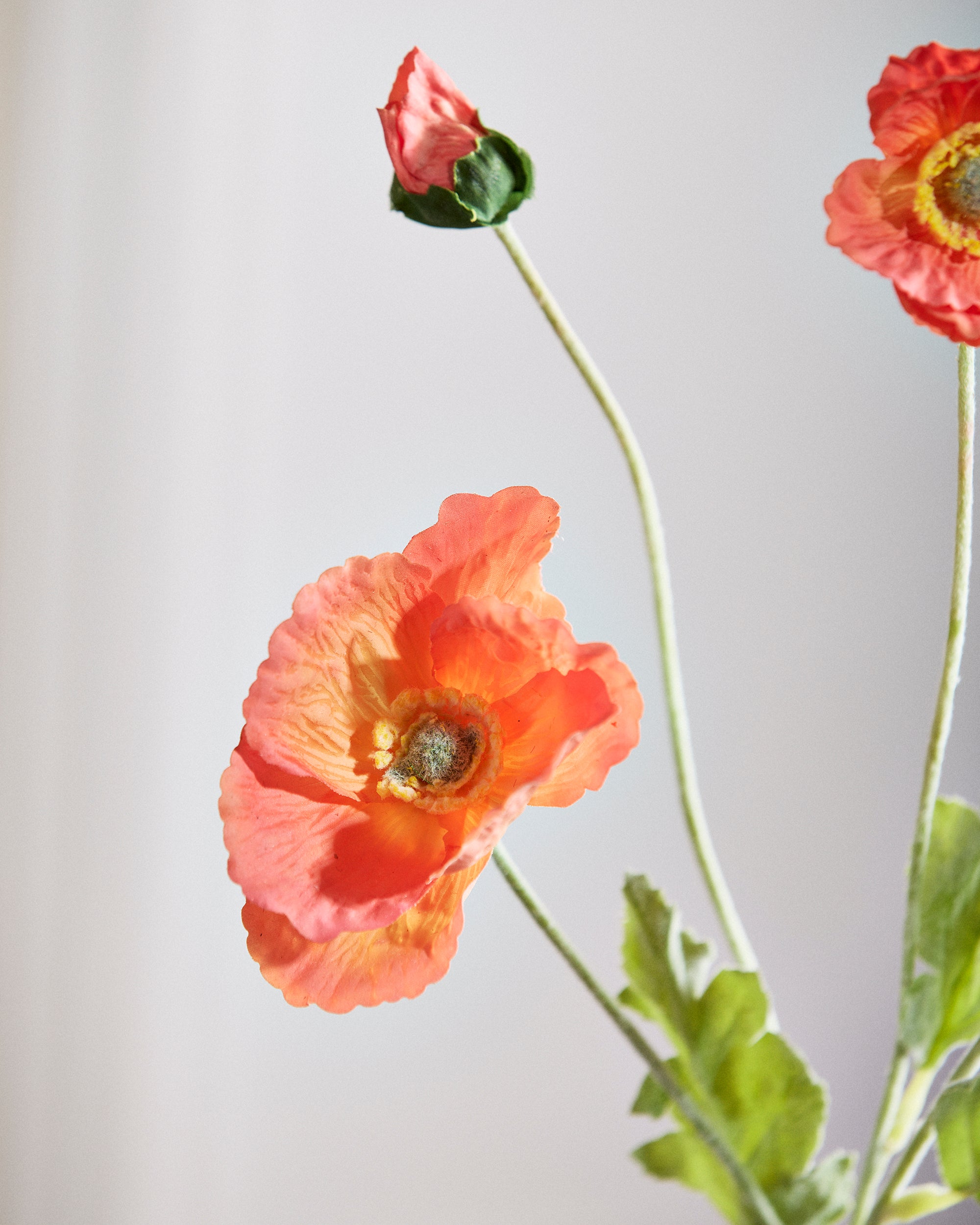 Eine orange Mohnblüte mit weichen, gedeckten Seidenblütenblättern – latexbeschichtet für ein naturgetreues, haptisches Erlebnis. Die Blütenblätter haben eine matte Oberfläche und eine kühle, natürliche Textur, genau wie eine frisch gepflückte Blume. Wunderschön allein oder in Kombination mit Komplementärfarben.