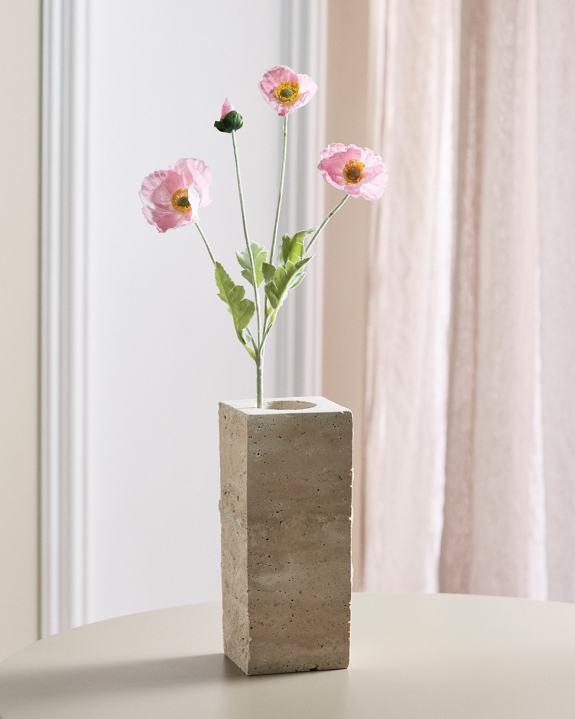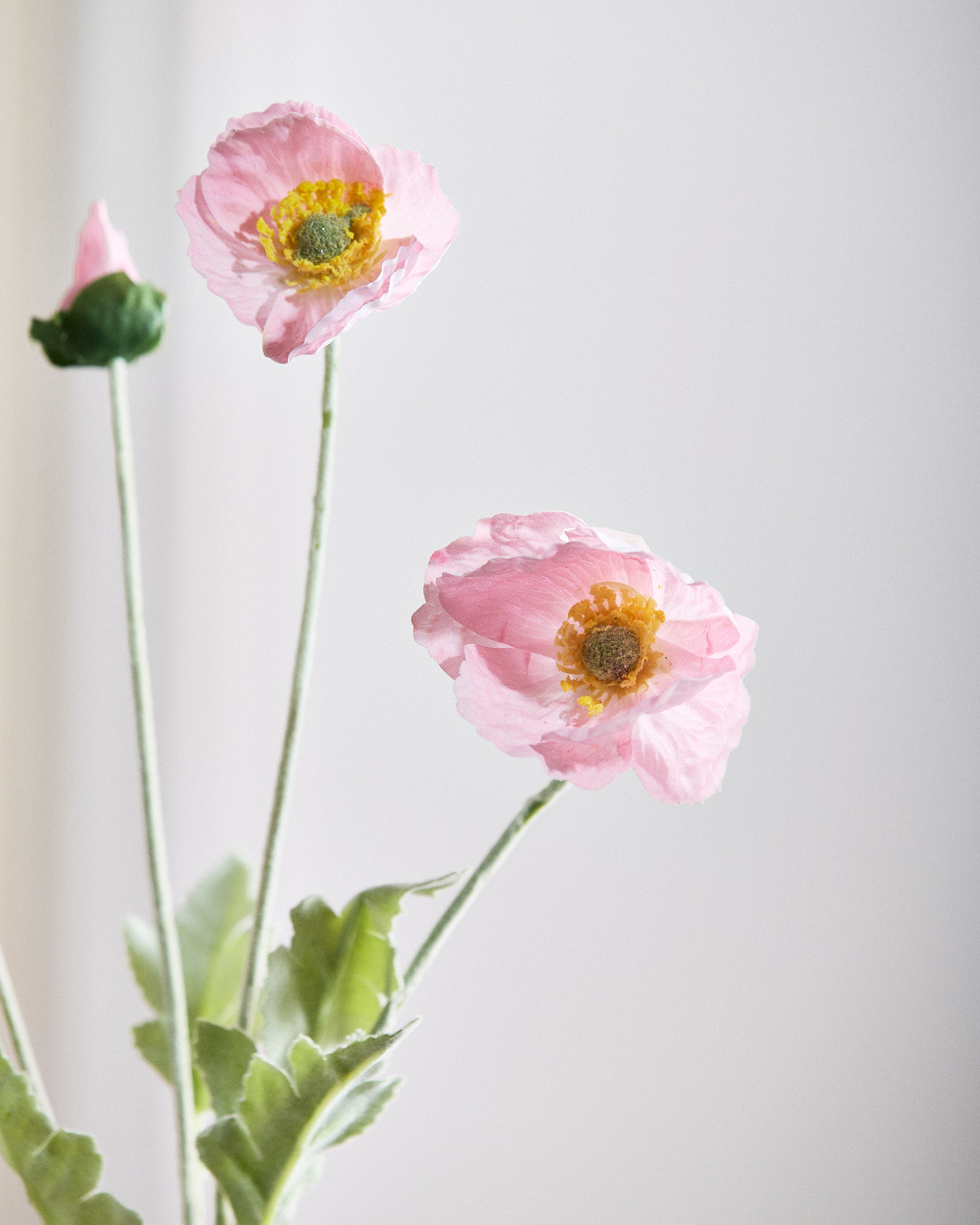Eine pink Mohnblüte mit weichen, gedeckten Seidenblütenblättern – latexbeschichtet für ein naturgetreues, haptisches Erlebnis. Die Blütenblätter haben eine matte Oberfläche und eine kühle, natürliche Textur, genau wie eine frisch gepflückte Blume. Wunderschön allein oder in Kombination mit Komplementärfarben.