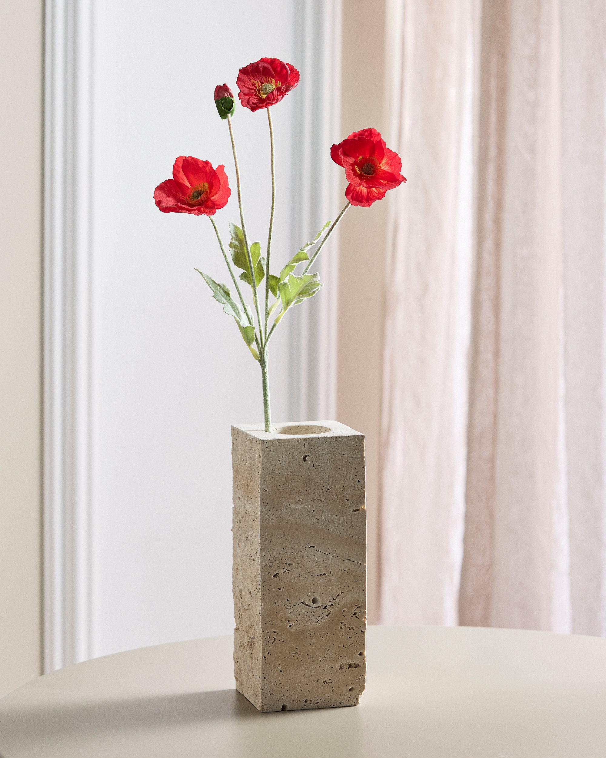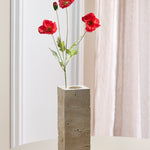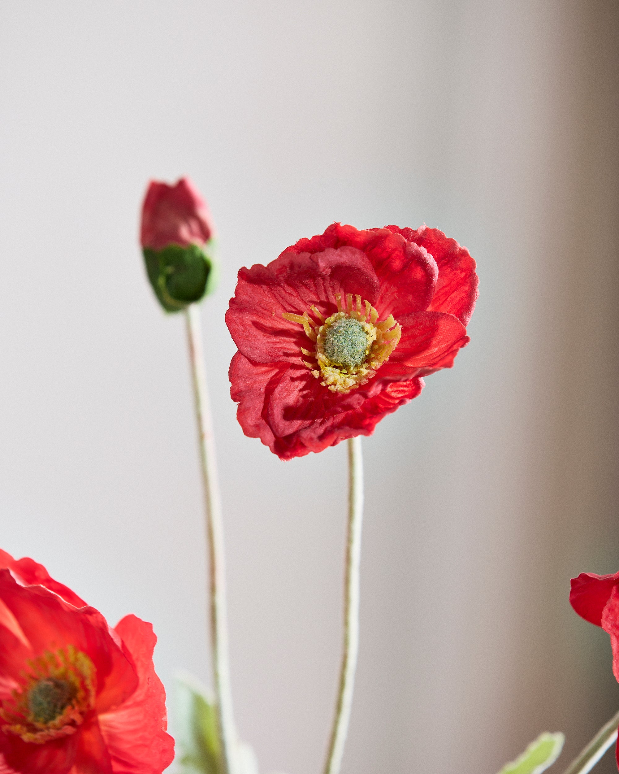 Eine Rot Mohnblüte mit weichen, gedeckten Seidenblütenblättern – latexbeschichtet für ein naturgetreues, haptisches Erlebnis. Die Blütenblätter haben eine matte Oberfläche und eine kühle, natürliche Textur, genau wie eine frisch gepflückte Blume. Wunderschön allein oder in Kombination mit Komplementärfarben.