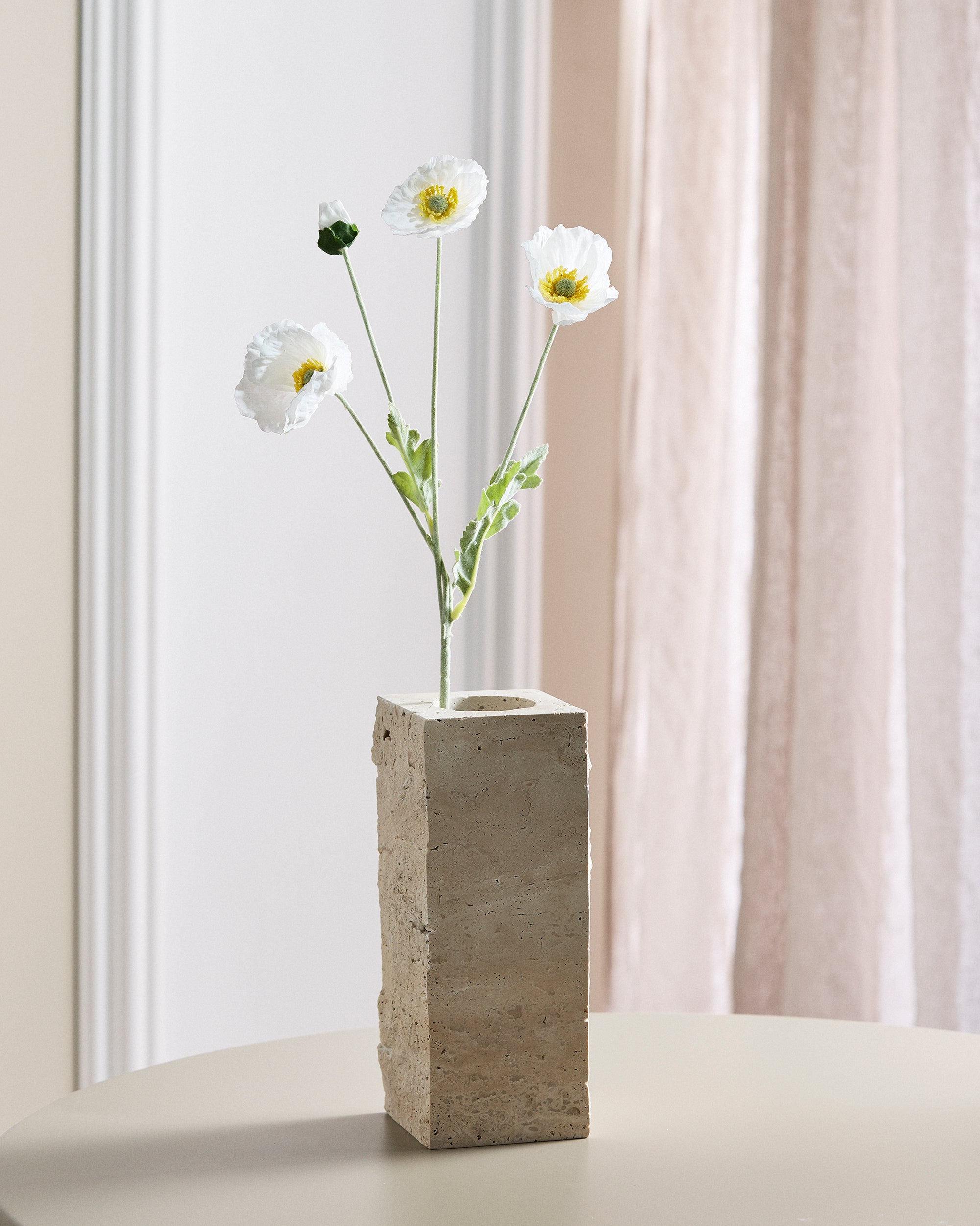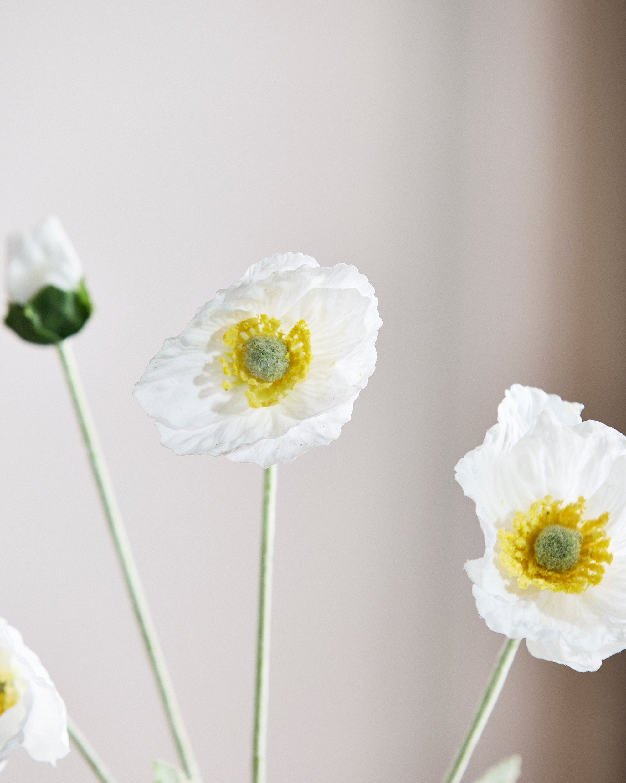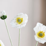 Eine Weiß Mohnblüte mit weichen, gedeckten Seidenblütenblättern – latexbeschichtet für ein naturgetreues, haptisches Erlebnis. Die Blütenblätter haben eine matte Oberfläche und eine kühle, natürliche Textur, genau wie eine frisch gepflückte Blume. Wunderschön allein oder in Kombination mit Komplementärfarben.