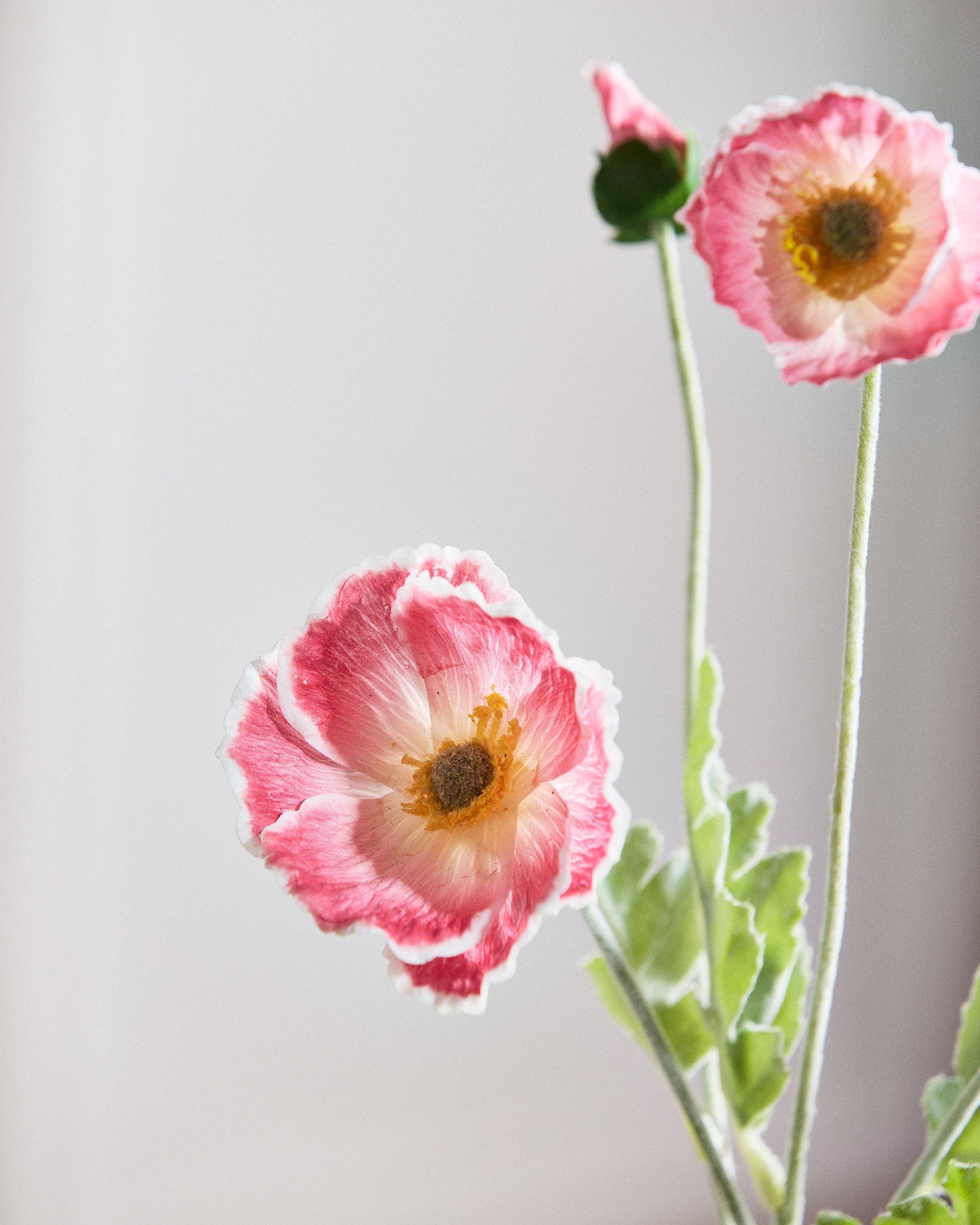 Eine weiß/rot Mohnblüte mit weichen, gedeckten Seidenblütenblättern – latexbeschichtet für ein naturgetreues, haptisches Erlebnis. Die Blütenblätter haben eine matte Oberfläche und eine kühle, natürliche Textur, genau wie eine frisch gepflückte Blume. Wunderschön allein oder in Kombination mit Komplementärfarben.
