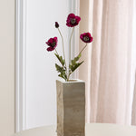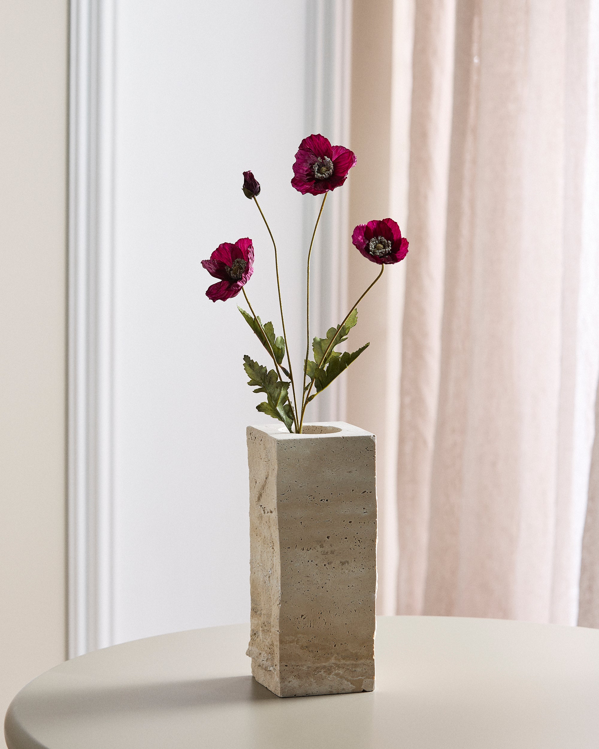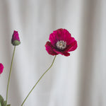 Die Stiele und Blätter sind sorgfältig mit kleinen Härchen bedeckt, wodurch das natürliche Aussehen einer Mohnblume nachgebildet wird und ihrer Schönheit eine authentische Dimension verliehen wird.